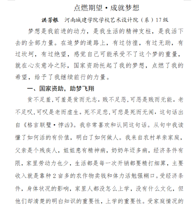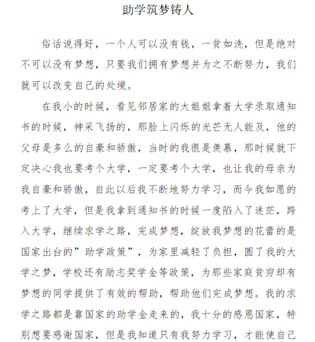 此征集活动进一步宣传了国家对学生资助工作的政策,通过学生的亲身参与,不仅让同学们更清楚的感受到国家政策带来的帮助,也让学生深切感受到来自国家和学校对同学们的关心和温暖,鼓励同学们努力学习,积极向上,也教育同学们常怀感恩之心。国家资助政策润物无声,为莘莘学子们创造了更好的条件和资源,让同学们能够顺利完成自己的学业和梦想。此次“助学、筑梦、铸人”作品征集活动所有的同学们都积极参加,增强了学生对于国家资助政策的了解,推进了我院资助育人工作的良好开展。