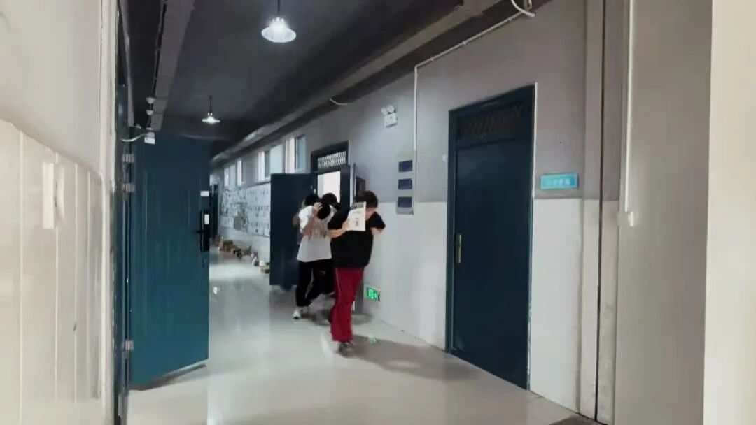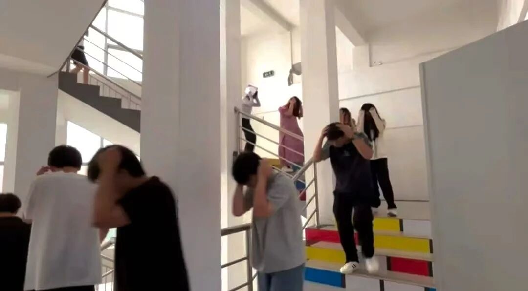 演练当天,实验室与教室内气氛严肃而紧张。随着防震警报声骤响,正在听讲的学生迅速进入应急状态:他们立即停止手头动作,按照前期学习的避险知识,迅速蜷身躲在课桌下,双手护头、身体紧贴桌脚。当教师发出疏散指令后,学生们以低姿态有序起身,一手护头、一手扶住栏杆或墙壁,沿预定路线快速撤离——整个过程中,队伍始终保持紧凑有序,无推搡、拥挤现象。